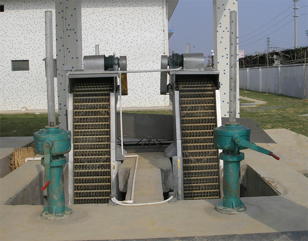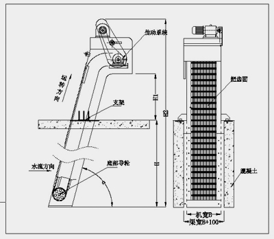 按水流方向耙齒鏈類同于格柵,在耙齒鏈軸上裝配的耙齒間隙可以根據(jù)使用條件進(jìn)行選擇,當(dāng)耙齒把流體中的固態(tài)懸浮物以及漂浮物分離后可以保證水流暢通流過,整個過程可以是連續(xù)的,也可以是間歇的。