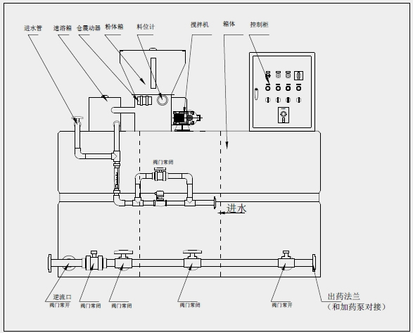 干粉絮凝劑從螺旋推進器內進入速溶器內與清水進行預混,被濕潤的物料進入配制槽進行攪拌稀釋,按要求濃度進行配制;配制過程中,進水量在流量計觀測下必須相對穩(wěn)定,從而保證在整個工作工程中,配制溶液濃度不變。