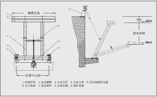 XB旋轉式潷水器是排出SBR反應池中上清液的專用設備。旋轉式潷水器通過電動推桿的驅動,潷水堰槽繞排水管,實現(xiàn)潷水器連續(xù)排水。