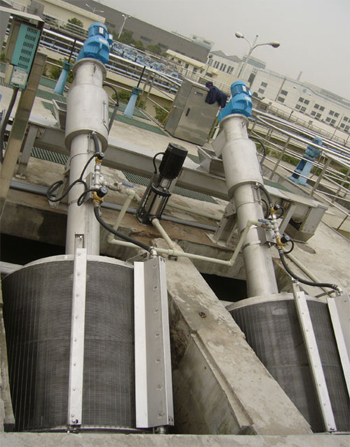 旋轉清污網筒在水中以35°傾角做每分鐘5~8r/min的圓周運動,網筒的1/3浸沒在水中。污水及漂浮物從網筒下口進入網筒內部,漂浮物附著于網筒內壁從水中帶出,當網筒轉到高點,雜質由于重力作用掉入垃圾輸送系統(tǒng),經輸送壓榨至出料口。被過濾的污水經過網筒間隙流走。